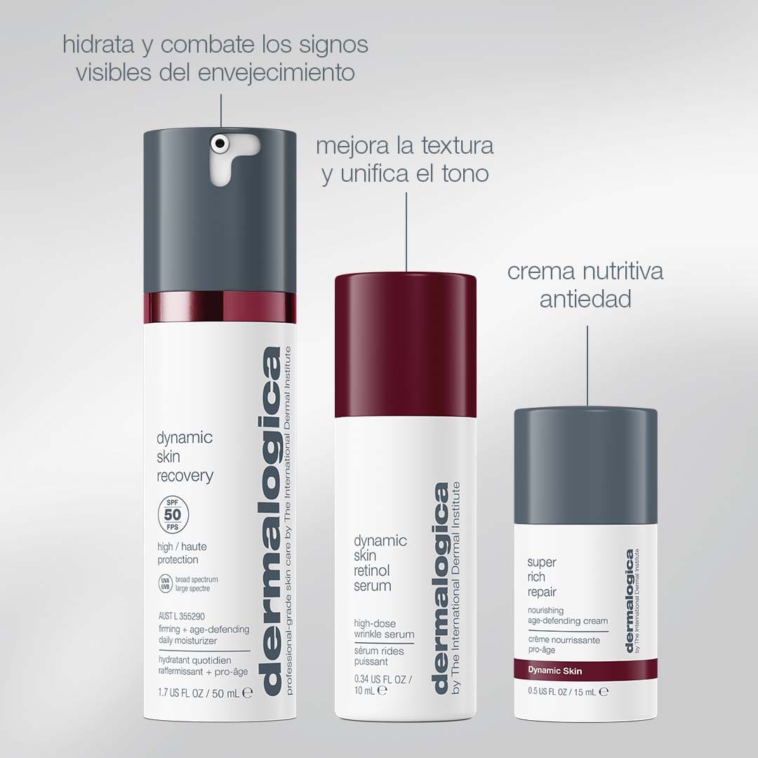 Lo esencial para una piel suave: Hidratación y protección UV por la mañana, cuidado intensivo con retinol por la noche para obtener resultados visibles. Por la noche, aplica el Sérum de Retinol Dynamic Skin para reducir los signos de la edad. Finaliza con Super Rich Repair, una crema nutritiva y protectora intensiva.