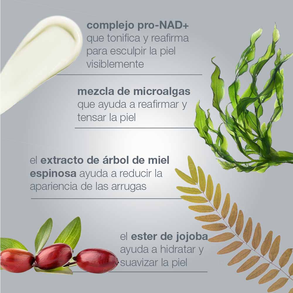 - Apoya la estructura de la piel para una tez visiblemente más definida.